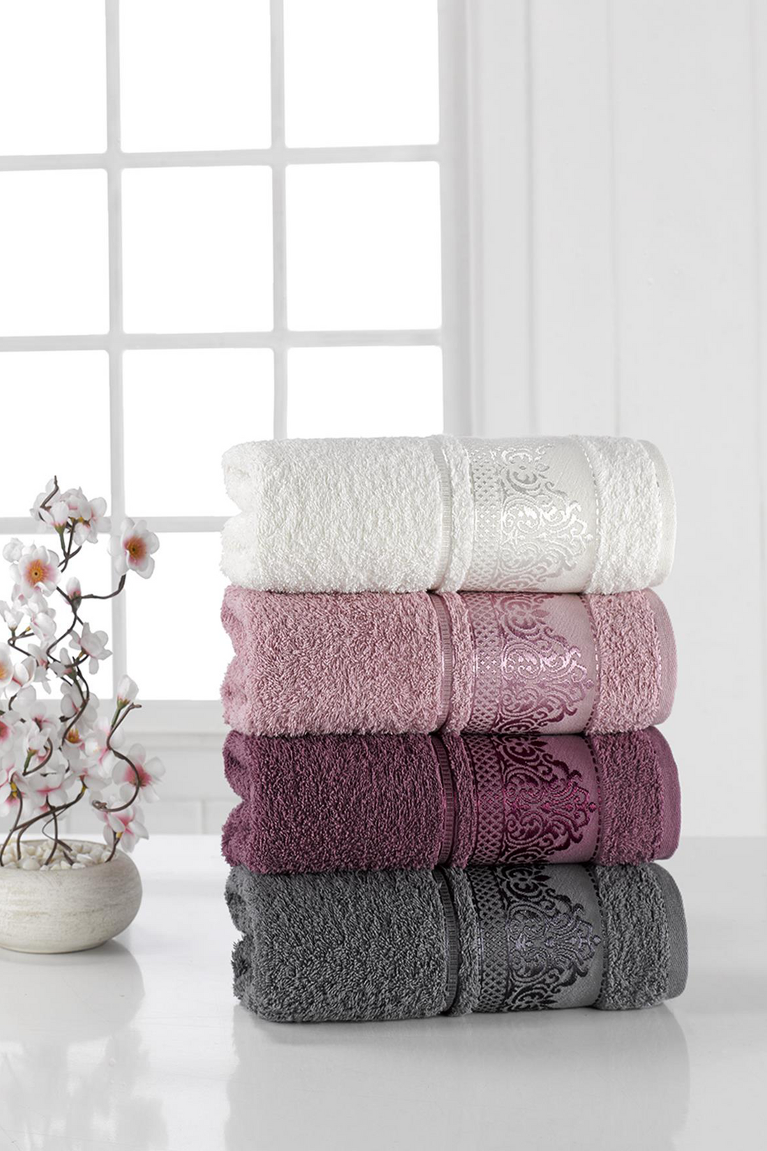 Eva - İpeksi Gri-Mürdüm - Banyo Havlu Seti - Gri - Mürdüm - 4 Parça